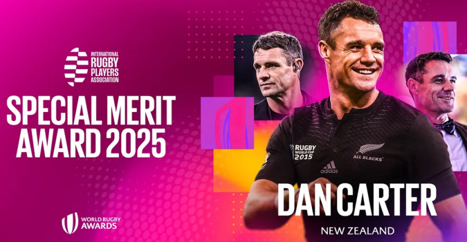 Wielki zawodnik All Blacks i członek World Rugby Hall of Fame, Dan Carter, został uhonorowany nagrodą International Rugby Players Association Special Merit Award podczas gali World Rugby Awards, która odbyła się w Muzeum Nauki w Londynie 26 września, w przededniu finału Pucharu Świata w Rugby Kobiet 2025.