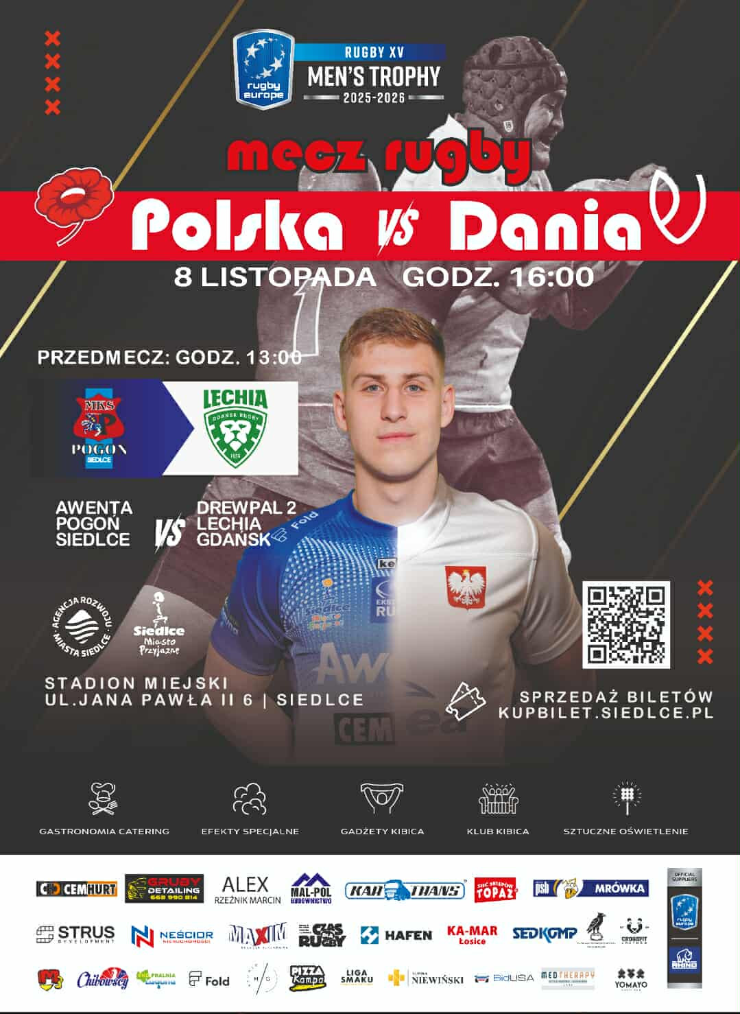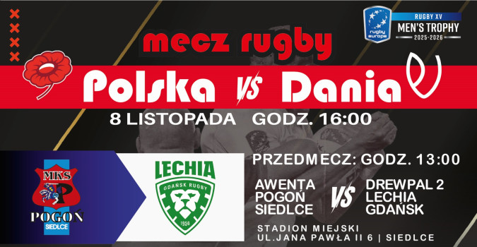 Międzypaństwowy mecz seniorów Rugby Europe Trophy sezonu 2025/2026 pomiędzy Polską, a Danią zostanie rozegrany w sobotę, 08 listopada br. o godz. 16.00 na Stadionie Miejskim w Siedlcach, ul. Jana Pawła II 6.