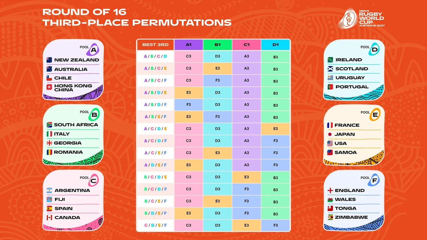 Zakładając, że cztery najlepsze drużyny w grupie 3 w momencie losowania (Gruzja, Urugwaj, Hiszpania, USA) zdobędą cztery najlepsze trzecie miejsca, Gruzja (B3) zagra ze zwycięzcą grupy D. Ponownie, jeśli Puchar Świata w Rugby 2027 będzie odzwierciedlał ranking, oznacza to, że Lelos zagrają z Irlandią 20 lat po ich ostatnim spotkaniu turniejowym we Francji. Na tej samej zasadzie Urugwaj (D3) zmierzyłby się z Republiką Południowej Afryki (B1), a Hiszpania (C3) z Nową Zelandią (A1). Jak wspomniano powyżej, USA (E3) musiałyby poczekać na ujawnienie tożsamości pozostałych najwyżej sklasyfikowanych drużyn, zanim poznają swój los.