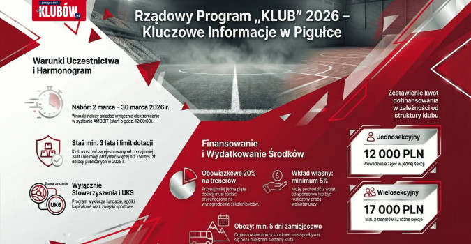 Ministerstwo Sportu i Turystyki oficjalnie poinformowało o terminie naboru do tegorocznej edycji Rządowego Programu „KLUB” oraz o wyborze Operatora Programu na lata 2026-2028.